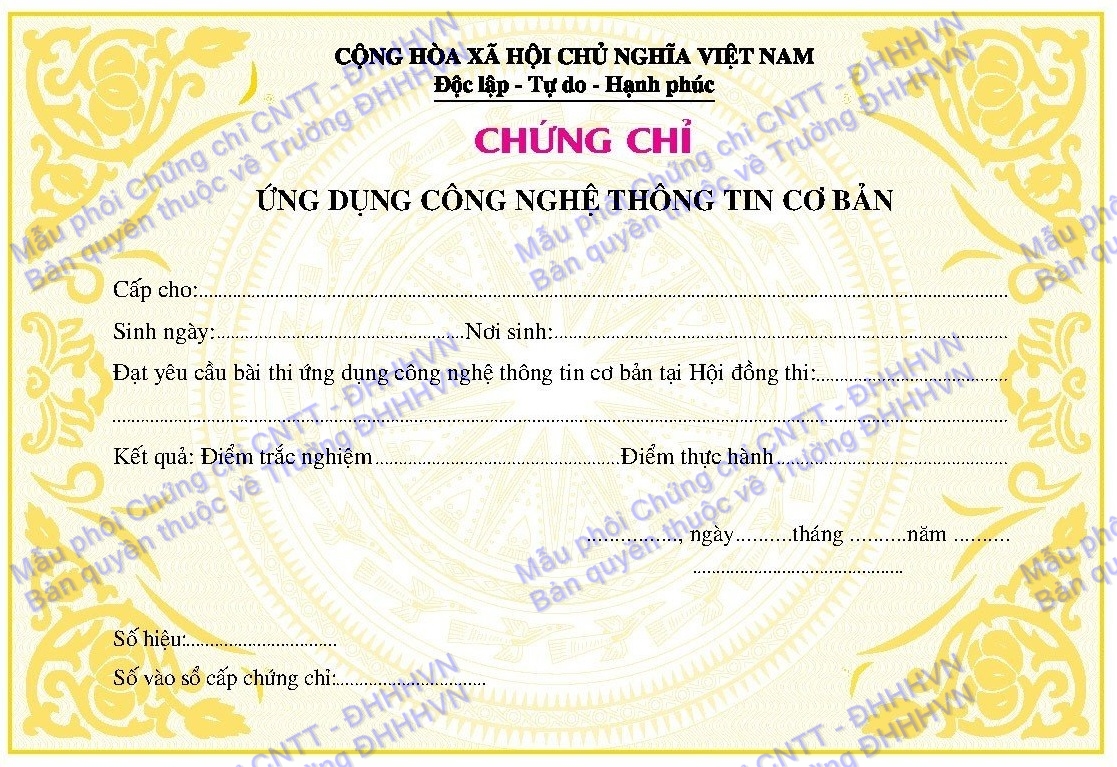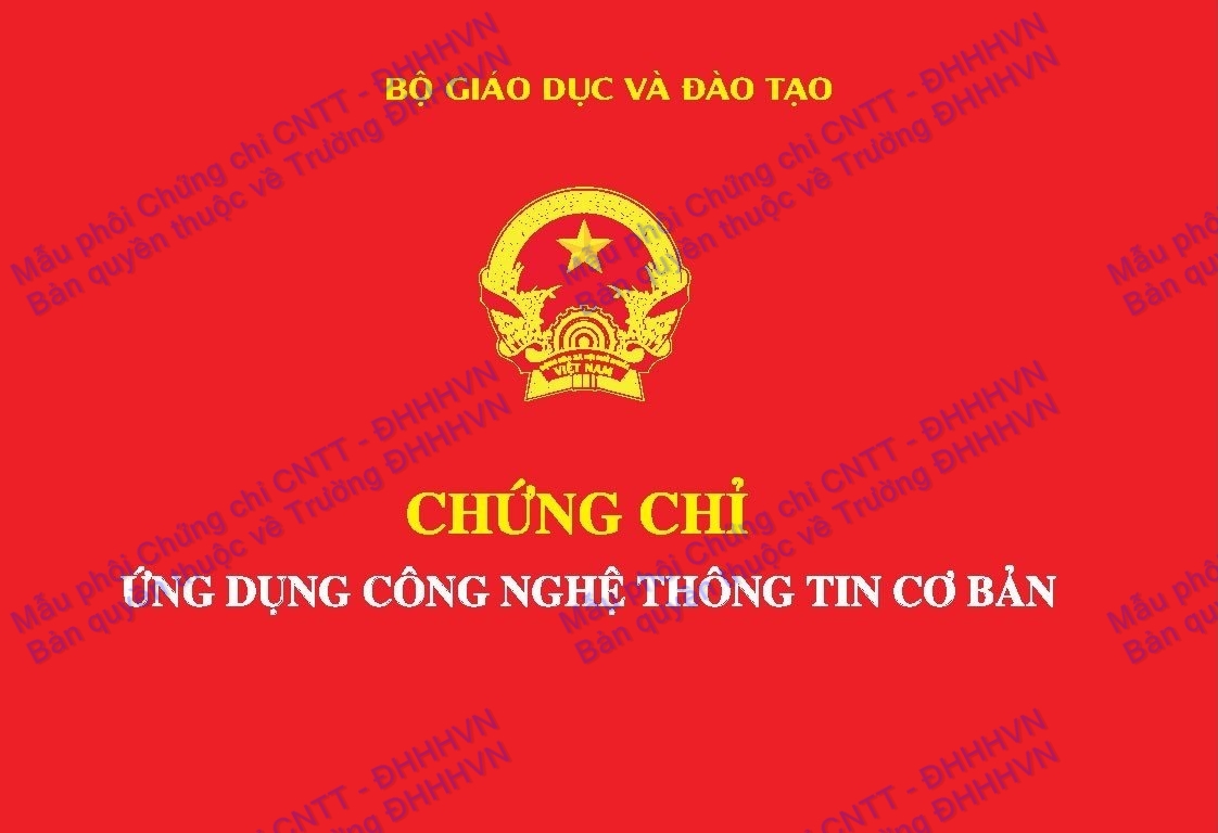Thực hiện các quy định tại Thông tư 21/2019/TT-BGDĐT ngày 29/11/2019 của Bộ trưởng Bộ GD&ĐT ban hành Quy chế quản lý bằng tốt nghiệp trung học cơ sở, bằng tốt nghiệp trung học phổ thông, bằng tốt nghiệp trung cấp sư phạm, bằng tốt nghiệp cao đẳng sư phạm, văn bằng giáo dục đại học và chứng chỉ của hệ thống giáo dục quốc dân; Thông tư 27/2019/TT-BGDĐT ngày 30/12/2019 của Bộ trưởng Bộ GD&ĐT quy định nội dung chính ghi trên văn bằng và phụ lục văn bằng giáo dục đại học; Các quy định liên quan của Bộ LĐTBXH, Bộ GTVT, Trường Đại học Hàng hải Việt nam công bố sử dụng mẫu phôi Chứng chỉ Công nghệ thông tin như sau: