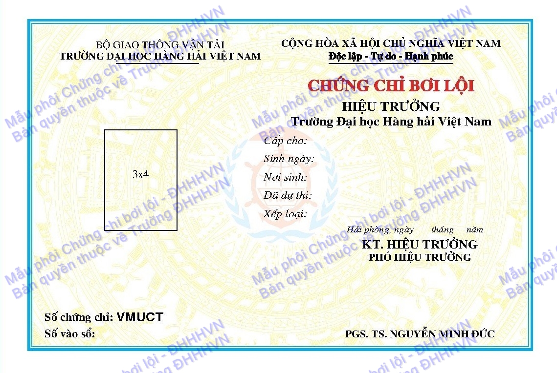 Thực hiện các quy định tại Thông tư 21/2019/TT-BGDĐT ngày 29/11/2019 của Bộ trưởng Bộ GD&ĐT ban hành Quy chế quản lý bằng tốt nghiệp trung học cơ sở, bằng tốt nghiệp trung học phổ thông, bằng tốt nghiệp trung cấp sư phạm, bằng tốt nghiệp cao đẳng sư phạm, văn bằng giáo dục đại học và chứng chỉ của hệ thống giáo dục quốc dân; Thông tư 27/2019/TT-BGDĐT ngày 30/12/2019 của Bộ trưởng Bộ GD&ĐT quy định nội dung chính ghi trên văn bằng và phụ lục văn bằng giáo dục đại học; Các quy định liên quan của Bộ LĐTBXH, Bộ GTVT, Trường Đại học Hàng hải Việt nam công bố sử dụng mẫu phôi Chứng chỉ bơi lội như sau: