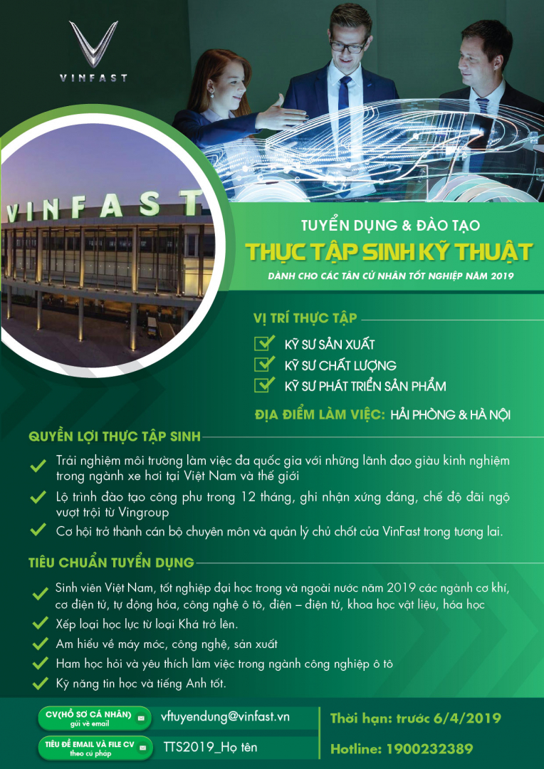 Hiện nay, nhằm xây dựng nguồn nhân lực tài năng cho các vị trí chuyên môn và quản lý chủ chốt, đóng vai trò quan trọng đến sự thành công của công ty, Vinfast có nhu cầu tuyển dụng sinh viên các trường Đại học khối ngành kỹ thuật tốt nghiệp năm 2019 cho vị trí thực tập sinh sau: