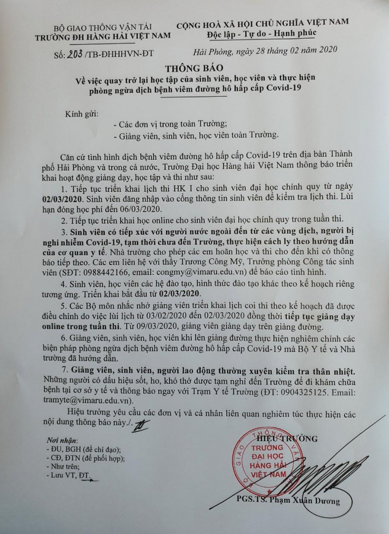 Thông báo vv quay trở lại học tập của sinh viên, học viên và thực hiện phòng ngừa dịch bệnh viêm đường hô hấp cấp Covid-19.