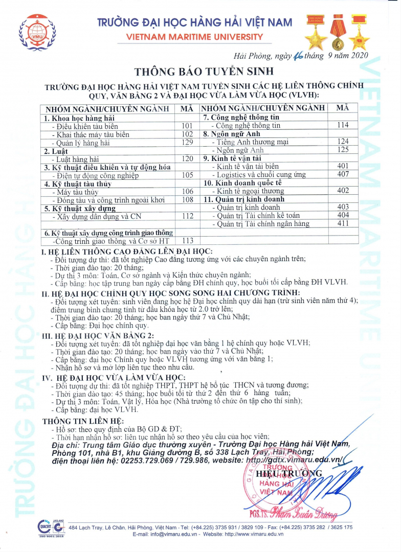 TRƯỜNG ĐẠI HỌC HÀNG HẢI VIỆT NAM TUYỂN SINH CÁC HỆ LIÊN THÔNG CHÍNH QUY, VĂN BẰNG 2 VÀ ĐẠI HỌC VỪA LÀM VỪA HỌC (VLVH) ĐỢT 2 NĂM 2020