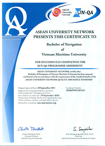 Ngày 21/02/2022, 4 chương trình đào tạo của Trường Đại học Hàng hải Việt Nam vừa chính thức được cấp chứng nhận bảo đảm chất lượng theo tiêu chuẩn AUN-QA của mạng lưới các trường đại học Đông Nam Á-AUN (ASEAN University Network) gồm các chương trình: Máy tàu biển, Điều khiển tàu biển, Kinh tế Hàng hải, Kinh doanh quốc tế và Logistics. Điều này đánh dấu một bước tiến quan trọng trong tiến trình hội nhập giáo dục đào tạo toàn cầu của Nhà trường.