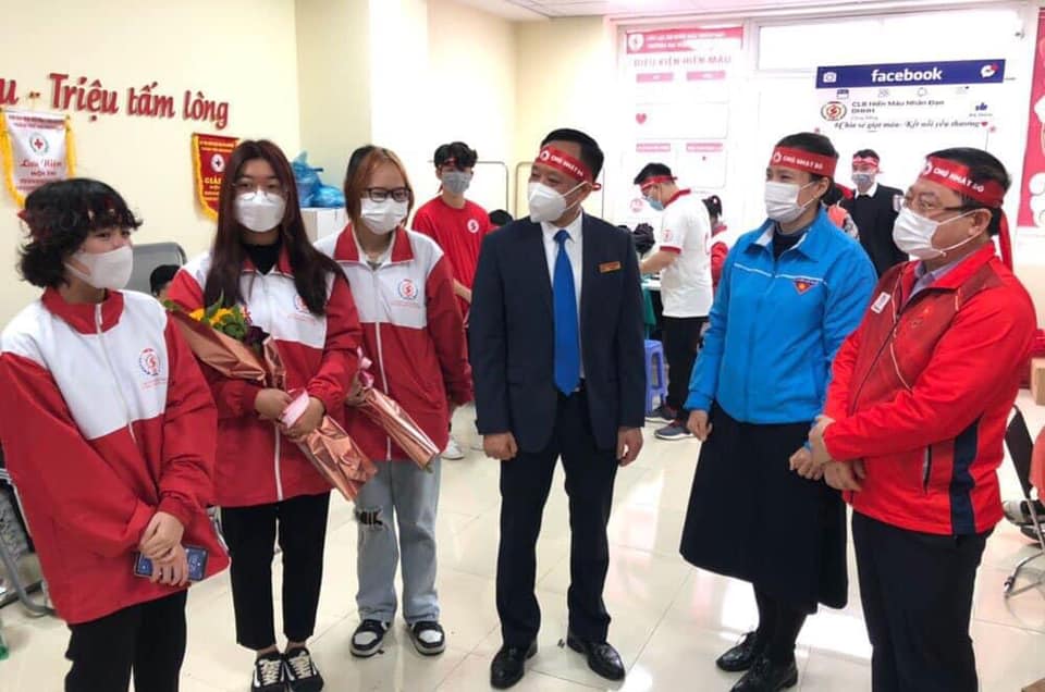 PGS.TS Phạm Xuân Dương – Hiệu trưởng Nhà trường trực tiếp tham gia hiến máu tình nguyện và tặng hoa các thành viên tham gia hiến máu TN