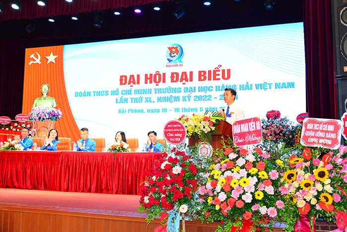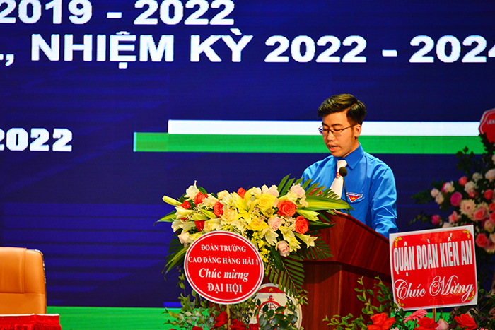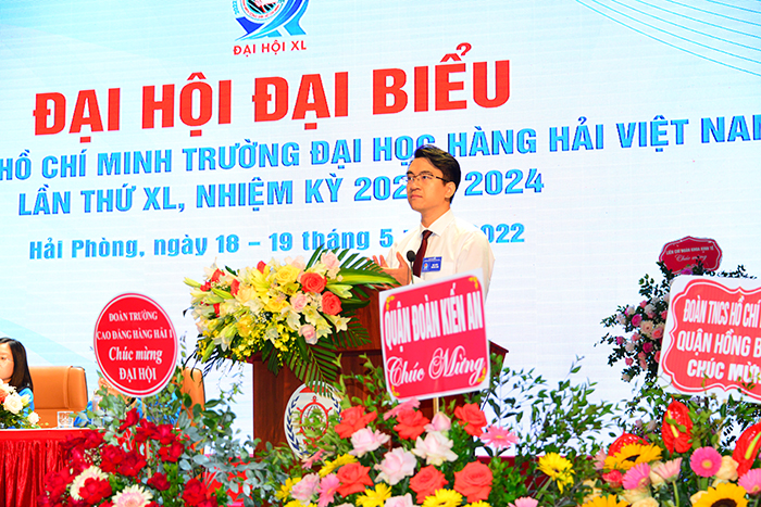 Đồng chí Ngô Việt Anh - Phó Bí thư đoàn trường đã trình bày báo cáo tóm tắt công tác Đoàn và phong trào thanh niên Trường Đại học Hàng Hải Việt Nam nhiệm kỳ 2019 - 2022 và mục tiêu, nhiệm vụ, giải pháp cho nhiệm kỳ mới 2022 - 2024.