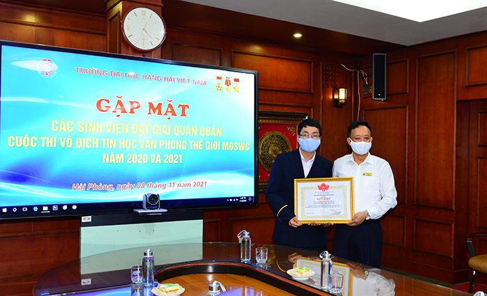 16h00 ngày 08/11/2021, PGS.TS Phạm Xuân Dương – Phó Bí thư Đảng ủy, Hiệu trưởng Trường ĐHHHVN chủ trì buổi Gặp mặt, biểu dương, khen thưởng các SV đạt giải Quán quân Cuộc thi vô địch Tin học Văn phòng Thế giới năm 2020 và 2021 tại Việt Nam và chuẩn bị dự vòng thi Chung kết Thế giới nhằm kịp thời động viên, khen thưởng, chia sẻ niềm vui chiến thắng với thầy, trò tham gia thi đấu.