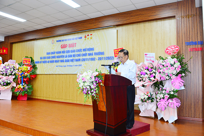 Phát biểu chào mừng tại buổi gặp mặt, PGS.TS Phạm Xuân Dương - Hiệu trưởng Trường Đại học Hàng hải cho biết: Trải qua hơn 66 năm xây dựng và phát triển, Trường Đại học Hàng hải Việt Nam đã đạt được những thành tích rất đáng tự hào góp phần phục vụ cho sự nghiệp phát triển kinh tế - xã hội, đảm bảo an ninh - quốc phòng của thành phố Hải Phòng, ngành Giao thông vận tải và đất nước. Vinh quang thuộc về các thế hệ nối tiếp các nhà giáo đã và đang cần mẫn, tận tâm ngày đêm đóng góp quan trọng và quyết định đến việc ươm trồng các thế hệ các nhà quản lý và chuyên gia cho đất nước, “từng viên gạch xây lên đều là nhưng giọt mồ hôi, sương máu của các thế hệ nối tiếp ấy.”