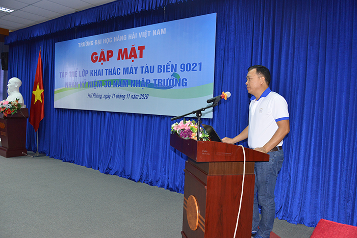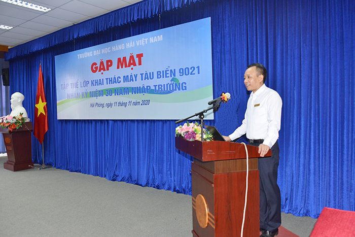 Chào đón tập thể lớp Khai thác Máy tàu biển 9021 nhân kỷ niệm 30 năm nhập Trường, PGS.TS Phạm Xuân Dương – Hiệu trưởng Nhà trường rất vui mừng và phấn khởi trước những thành công mà các cựu sinh viên lớp Khai thác Máy tàu biển 9021 đã đạt được trong chặng đường 30 năm qua. Thành công của các cựu sinh viên là niềm tự hào, là thước đo về chất lượng đào tạo của Nhà trường. Thay mặt Nhà trường, Hiệu trưởng cảm ơn những tình cảm tốt đẹp mà các cựu sinh viên đã dành cho Nhà trường, đồng thời gửi những lời chúc mừng tốt đẹp nhất đến các cựu sinh viên, chúc các cựu sinh viên luôn mạnh khỏe, hạnh phúc, luôn nhớ về một thời sinh viên trong những năm tháng gian khó nhưng rất đỗi nghĩa tình dưới Mái trường Đại dương thân yêu.