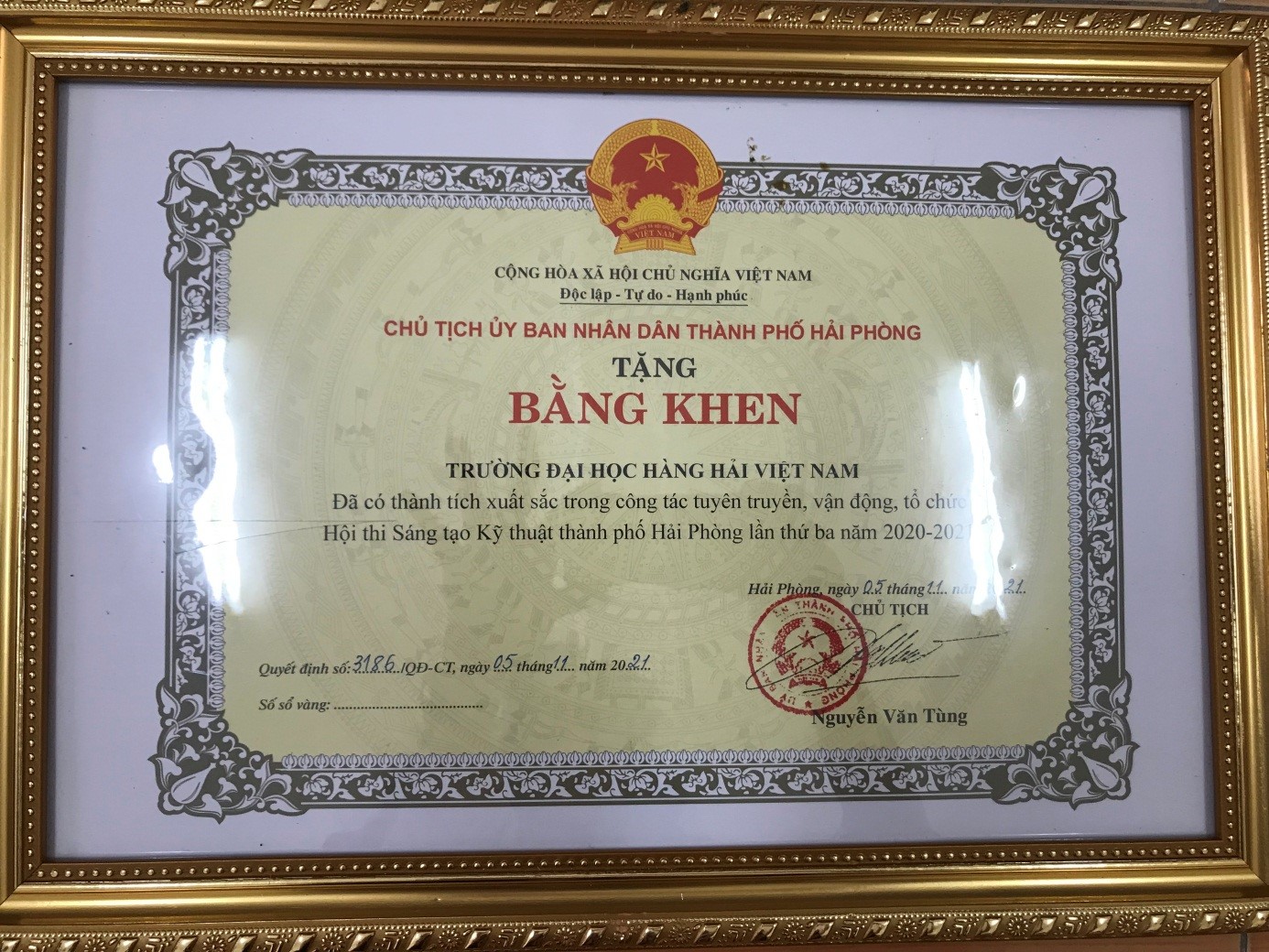Ngày 04/10/2021, Ủy Ban Nhân dân Thành phố Hải Phòng đã có Quyết định 2855/QĐ-UBND về việc tặng Giải thưởng và Giấy chứng nhận Hội thi Sáng tạo kỹ thuật thành phố Hải Phòng lần thứ 3, năm 2020-2021. Theo đó, Trường Đại học Hàng hải Việt Nam vinh dự đạt được 07 giải thưởng cá nhân, 01 Bằng khen Tập thể đã có thành tích xuất sắc trong công tác tuyên truyền, vận động tổ chức Hội thi Sáng tạo Kỹ thuật thanh phố Hải Phòng lần thứ ba năm 2020-2021. Có 02 công trình tiêu biểu được Hội đồng giám khảo đánh giá cao và đạt giải Nhất bởi các đề tài đều có tính mới, khả năng nhân rộng và mang lại hiệu quả kinh tế-xã hội.