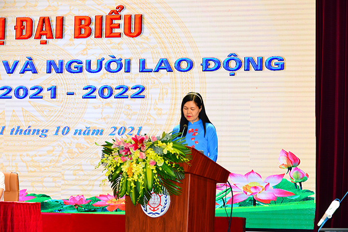 Đồng chí Đào Thị Huyền – Phó Chủ tịch Liên đoàn Lao động Thành phố Hải Phòng phát biểu tại Hội nghị.