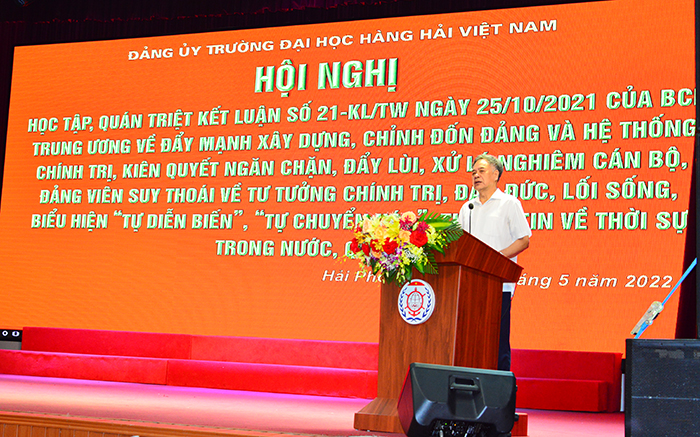 08h00 ngày 13/05, Trường Đại học Hàng hải Việt Nam đã tổ chức: “Hội nghị học tập, quán triệt kết luận số 21 – KL/TW ngày 25/10/2021 của BCH trung ương về đẩy mạnh xây dựng, chỉnh đốn đảng và hệ thống chính trị, kiên quyết ngăn chặn, đẩy lùi, xử lý nghiêm cán bộ, đảng viên suy thoái về tư tưởng chính trị, đạo đức, lối sống, biểu hiện “tự diễn biến”, “tự chuyển hóa” và thông tin về tình hình thời sự trong nước, quốc tế thời gian qua”. PGS.TS Nguyễn Viết Thông – Nguyên Tổng thư ký Hội đồng Lý luận Trung ương là báo cáo viên.