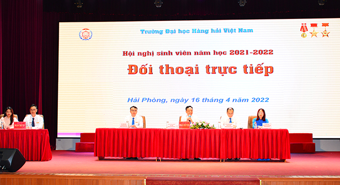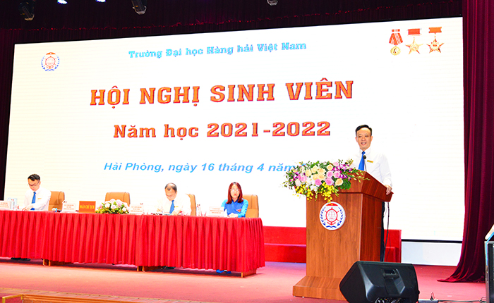 08h00 ngày 16/04/2022, Trường Đại học Hàng hải Việt Nam đã tổ chức “Hội nghị sinh viên năm học 2021-2022” nhằm đánh giá, tổng kết những thuận lợi, khó khăn, kết quả đạt được trong công tác đào tạo, công tác sinh viên năm học 2020-2021và các nhiệm vụ trọng tâm, các giải pháp đổi mới đang triển khai thực hiện trong năm học 2021-2022; kênh đối thoại trực tiếp để lắng nghe các ý kiến phản hồi của sinh viên, tiếp tục trao đổi, giải đáp các thắc mắc, kiến nghị của sinh viên. PGS.TS Phạm Xuân Dương – Hiệu trưởng Nhà trường đã trực tiếp chủ trì Hội nghị cùng với sự tham dự của các thầy trong Ban Giám hiệu Nhà trường, Công đoàn, Thủ trưởng các đơn vị, BCH Đoàn TN - Hội SV và 400 sinh viên là nhóm trưởng và chi hội trưởng chi hội sinh viên, các nhóm chuyên ngành.