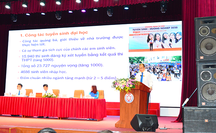 PGS.TS Nguyễn Minh Đức – Phó Hiệu trưởng Nhà trường báo cáo tổng kết công tác năm học 2020-2021 và định hướng trọng tâm năm học 2021-2022.