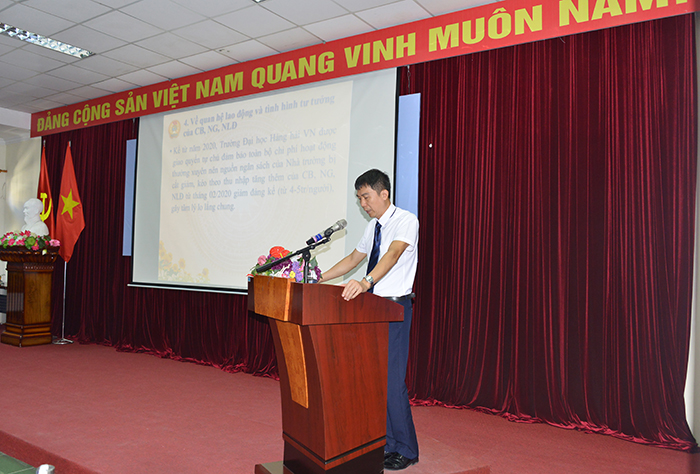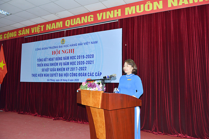 Hội nghị được nghe PGS.TS. Nguyễn Công Vịnh – Chủ tịch Công đoàn Trường trình bày báo cáo sơ kết giữa nhiệm kỳ thực hiện Nghị quyết Đại hội Công đoàn Việt Nam khoá 12, Đại hội Công đoàn thành phố Hải Phòng khoá 14 nhiệm kỳ 2018 - 2023 và Đại hội Công đoàn Trường khóa 29, nhiệm kỳ 2017-2022; đồng chí Phạm Thu Thưởng- UV BCH LĐLĐ TP Hải Phòng, Phó Chủ tịch thường trực Công đoàn Trường thay mặt Ban Chấp hành trình bày báo cáo tổng kết hoạt động công đoàn năm học 2019-2020 và triển khai nhiệm vụ năm học 2020-2021. Năm học 2019-2020 là năm diễn ra sự kiện chính trị quan trọng – Đại hội Đảng các cấp tiến tới Đại hội Đảng bộ Trường lần thứ XXVII, Đại hội Đảng bộ thành phố lần thứ XVI, Đại hội đại biểu toàn quốc lần thứ XIII của Đảng, nhiệm kỳ 2020-2025. Mặc dù do ảnh hưởng của dịch bệnh Covid – 19 nhưng CB, NG, NLĐ luôn tích cực thi đua, đổi mới nội dung chương trình đào tạo và phương hướng đánh giá kết quả học tập của sinh viên, xây dựng và triển khai chương trình đào tạo theo phương pháp tiếp cận CDIO nhằm từng bước cải tiến chất lượng dịch vụ đào tạo hướng đến người học, xây dựng chương trình theo chuẩn quốc tế AUN nhờ đó năng cao chất lượng đào tạo, góp phần hoàn thành xuất sắc nhiệm vụ năm học.