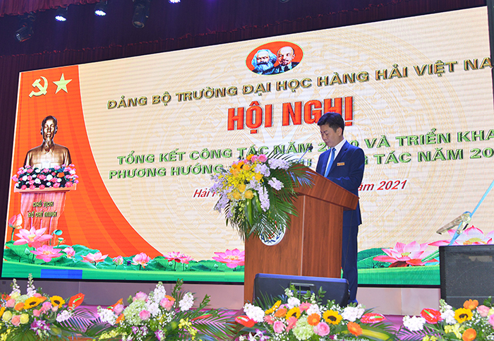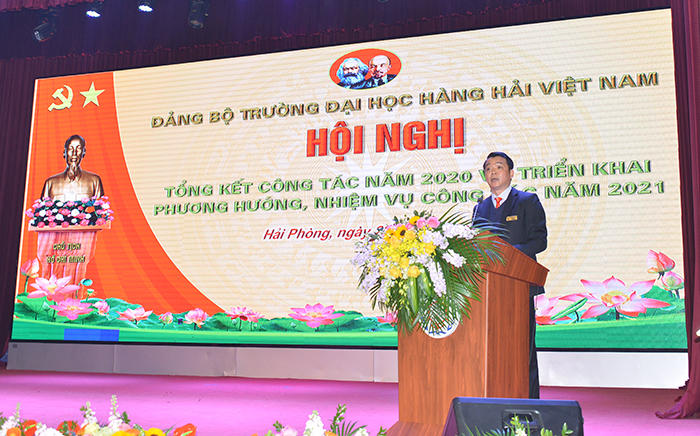 Thay mặt Đảng ủy Trường Đại học Hàng hải Việt Nam, PGS.TS Nguyễn Khắc Khiêm - Bí thư Đảng ủy, Chủ tịch Hội đồng Trường trình bày báo cáo tổng kết công tác Đảng năm 2020 và phương hướng, nhiệm vụ năm 2021 của Đảng bộ Trường. Năm 2020 là một năm đầy biến động với nhiều khó khăn, thách thức lớn do sự tác động kép của đại dịch Covid-19 và sự cắt giảm lớn về Ngân sách theo yêu cầu tự chủ đại học, song Đảng bộ, chính quyền Nhà trường đã hoàn thành cơ bản các chỉ tiêu, nhiệm vụ đã đề ra trong năm 2020.