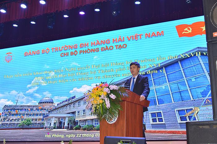 Ý kiến tham luận của Chi bộ Phòng Đào tạo với nội dung: “Thực tiễn triển khai thực hiện Nghị quyết Đại hội Đảng bộ Trường lần thứ XXVII và Nghị quyết Đại hội Đảng bộ Thành phố lần thứ XVI gắn với thực hiện các nhiệm vụ chuyên môn của đơn vị” do đồng chí Phạm Văn Thuần, Đảng ủy viên, Bí thư Chi bộ, Trưởng Đào tạo trình bày.