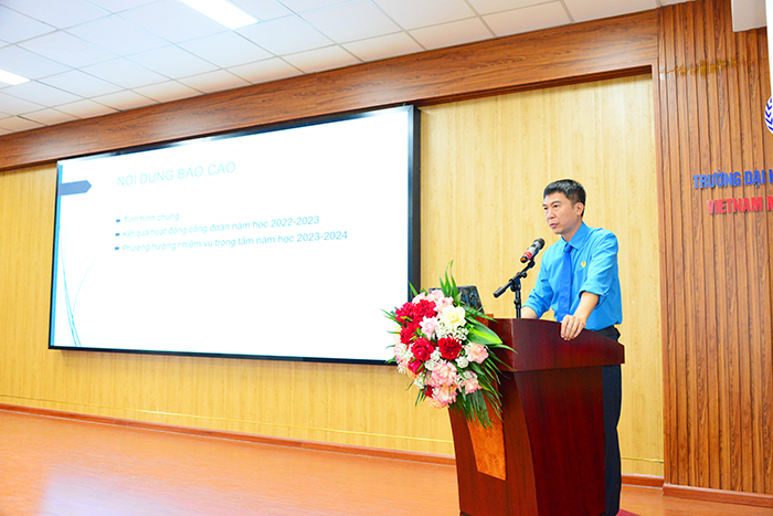 Hội nghị được nghe PGS.TS.Nguyễn Công Vịnh - Chủ tịch Công đoàn Trường trình bày báo cáo Tổng kết hoạt động Công đoàn năm học 2022 - 2023, triển khai nhiệm vụ năm học 2023- 2024 đồng thời chủ trì phần thảo luận của Hội nghị.