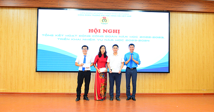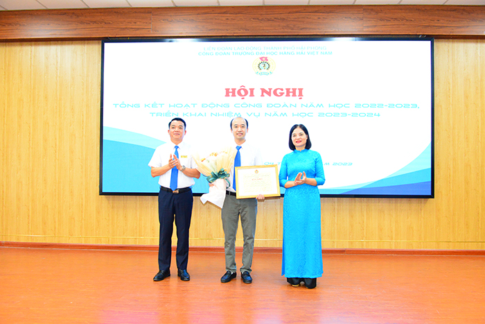 Đồng chí Lê Thị Thanh Thủy - Phó Chủ tịch LĐLĐ Tp Hải Phòng và PGS.TS. Nguyễn Khắc Khiêm - Bí thư Đảng ủy, Chủ tịch Hội đồng Trường trao Bằng khen của Tổng LĐLĐ Việt Nam cho đồng chí Vũ Huy Thắng - Đoàn viên Công đoàn, Giám đốc Thư viện Hàng hải “đã có thành tích xuất sắc trong phong trào thi đua lao động giỏi và xây dựng tổ chức Công đoàn vững mạnh năm học 2022-2023”