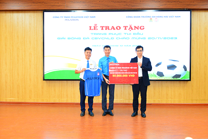 Cũng tại Hội nghị, Công ty TNHH PEGATRON VIỆT NAM đã trao tặng Công đoàn Trường ĐH Hàng hải Việt Nam số tiền 50.000.000đ để tài trợ toàn bộ trang phục thi đấu cho 13 đội tuyển tham dự Giải bóng đá CBVCNLĐ chào mừng ngày 20/11/2023 dự kiến sẽ được tổ chức trong tháng 11 năm 2023.