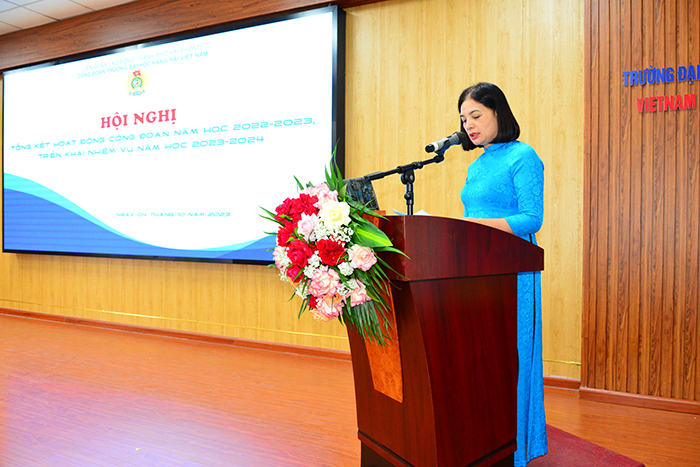 Phát biểu với Hội nghị, đồng chí Lê Thị Thanh Thủy - Phó Chủ tịch Liên đoàn Lao động Thành phố đánh giá rất cao vai trò của tổ chức Công đoàn Trường Đại học Hàng hải Việt Nam trong năm học qua đã đồng hành cùng với Liên đoàn Lao động Thành phố trong công cuộc đổi mới giáo dục, đào tạo, hoàn thành xuất sắc nhiệm vụ năm học 2022-2023, hy vọng trong năm học 2023-2024 Công đoàn Trường và các cấp Công đoàn tiếp tục phát huy các thành tích đạt được, ra sức thi đua, phấn đấu thực hiện tốt các nhiệm vụ được giao trong năm học 2023-2024.