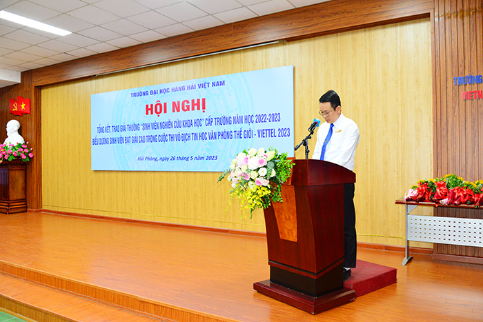 Sáng 26/05/2023, tại Trường Đại học Hàng hải Việt Nam đã diễn ra Hội nghị tổng kết hoạt động Sinh viên nghiên cứu khoa học năm học 2022-2023 và Cuộc thi vô địch Tin học văn phòng Thế giới - Viettel 2023 dưới sự chủ trì của PGS.TS Phạm Xuân Dương - Hiệu trưởng Nhà trường. Tham dự Hội nghị có các Thầy trong BGH Nhà trường, lãnh đạo các Khoa/Viện chuyên môn, các phòng ban liên quan, Đoàn TN, Hội sinh viên và đặc biệt là các thầy cô giảng viên hướng dẫn cùng các em sinh viên có công trình tham gia xét tặng cấp Trường năm học 2022-2023.