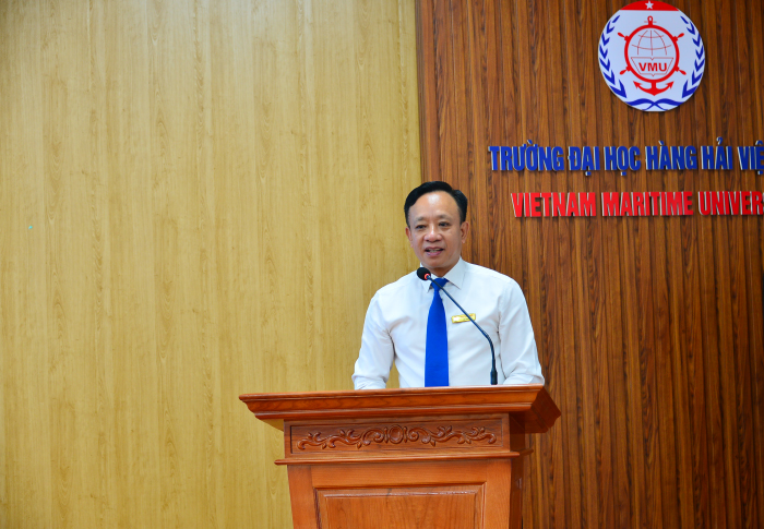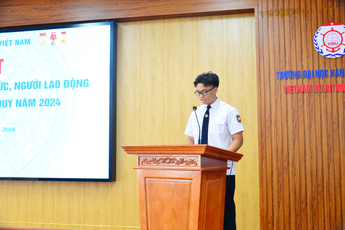Tân sinh viên Trường Đại học Hàng hải Việt Nam, bạn Vũ Quốc Trọng đại diện cho các bạn đã trúng tuyển Đại học năm 2024 phát biểu cảm ơn