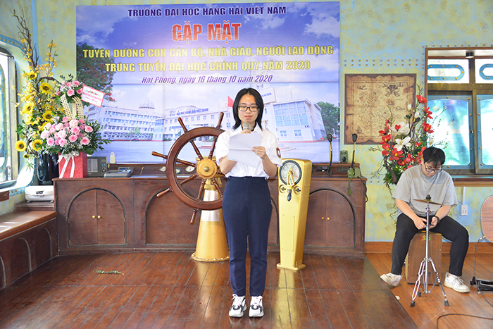 Bạn Tăng Hải Bình là con của Cô Bùi Thị Niên – Nhân viên Trung tâm Cơ khí thực hành đại diện cho các bạn đã trúng tuyển ĐH năm 2020 lên phát biểu, bày tỏ lòng biết ơn sự quan tâm của lãnh đạo Trường Đại học Hàng hải Việt Nam, sự dìu dắt của gia đình trong suốt 12 năm học qua, mong muốn quyết tâm phấn đấu đạt thêm nhiều thành công trong học tập và cuộc sống, tiếp tục rèn luyện, nỗ lực phấn đấu đạt kết quả học tập xuất sắc nhất xứng đáng là những hạt nhân tiêu biểu góp phần tạo nguồn nhân lực cho đất nước.