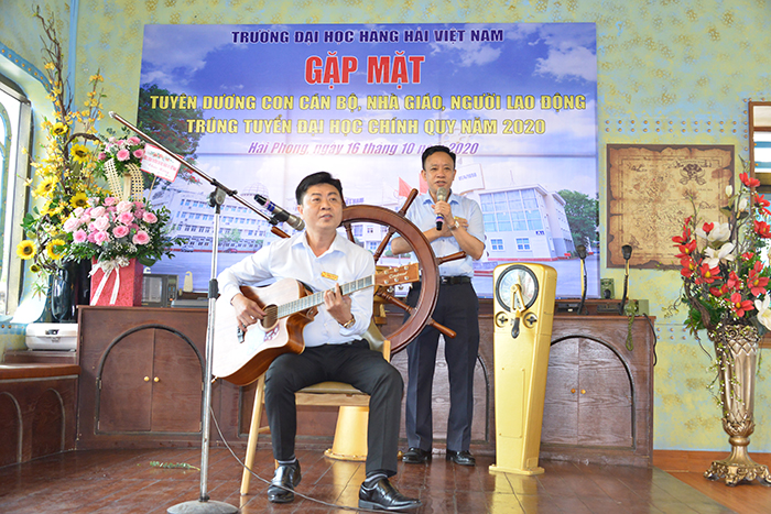 Phần giao lưu văn nghệ của PGS.TS Phạm Xuân Dương – Hiệu trưởng cùng Thầy Trương Công Mỹ - Trưởng phòng Công tác sinh viên với bài hát truyền thống của Trường Đại học Hàng hải Việt Nam “Mái trường Đại dương”.