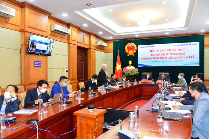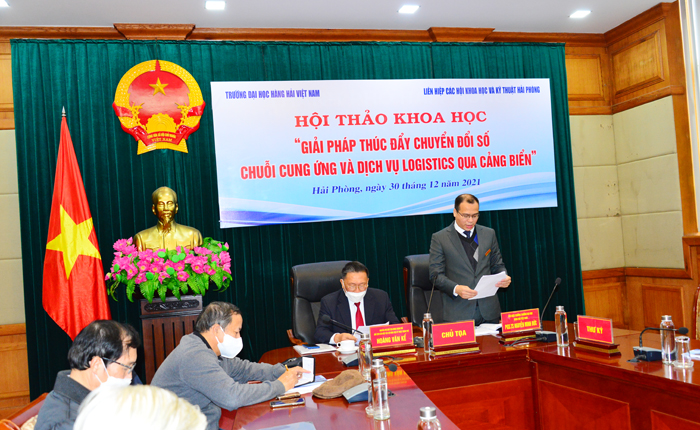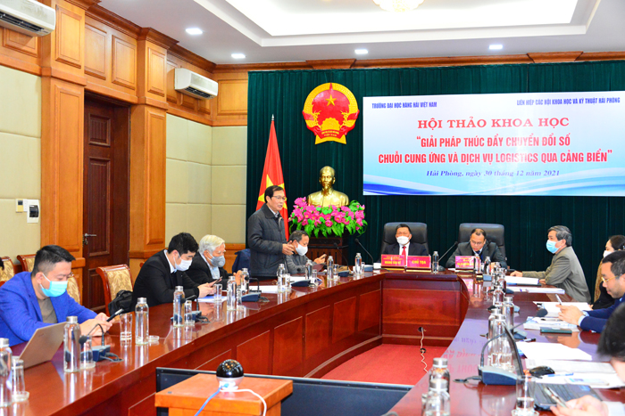 Với vai trò là trung tâm đào tạo nguồn nhân lực trình độ cao, nghiên cứu khoa học và chuyển giao công nghệ của quốc gia và khu vực nhằm thực hiện thành công chiến lược phát triển kinh tế biển của Tổ quốc, sáng ngày 30/12/2021, tại Trung tâm Hội nghị và Nhà khách Thành phố, Trường Đại học Hàng hải Việt Nam phối hợp với Liên hiệp các Hội khoa học và kỹ thuật Hải Phòng tổ chức Hội thảo Khoa học “Giải pháp thúc đẩy chuyển đổi số chuỗi cung ứng và dịch vụ Logistics qua cảng biển” dưới sự đồng chủ trì của PGS.TS Nguyễn Minh Đức - Phó Hiệu trưởng Trường Đại học Hàng hải Việt Nam  và TS. Hoàng Văn Kể - Chủ tịch Liên hiệp các Hội Khoa học và Kỹ thuật Hải Phòng. Trong bối cảnh dịch bệnh Covid-19, Hội thảo diễn ra dưới 2 hình thức trực tiếp và trực tuyến nhằm mục đích tìm ra định hướng nghiên cứu và đề xuất các giải pháp để thúc đẩy chuyển đổi số trong chuỗi cung ứng và dịch vụ Logistics qua các cảng biển.