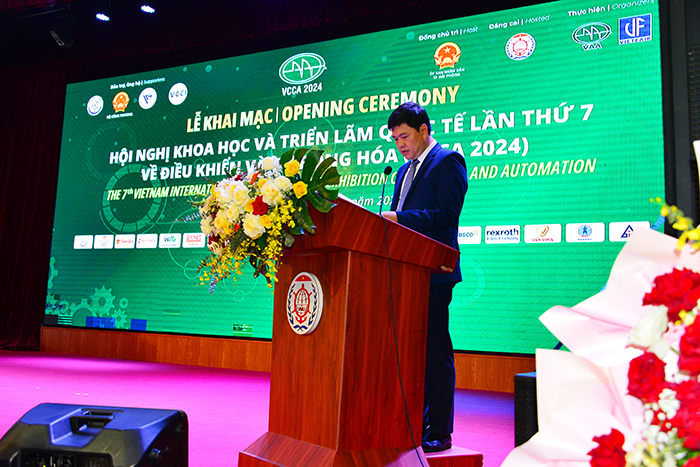 PGS.TS. Phạm Xuân Dương, Hiệu trưởng Trường Đại học Hàng hải Việt Nam - đơn vị đăng cai tổ chức Hội nghị khoa học và Triển lãm quốc tế lần thứ 7 về Điều khiển và Tự động hóa(VCCA 2024) phát biểu tại Lễ Khai mạc