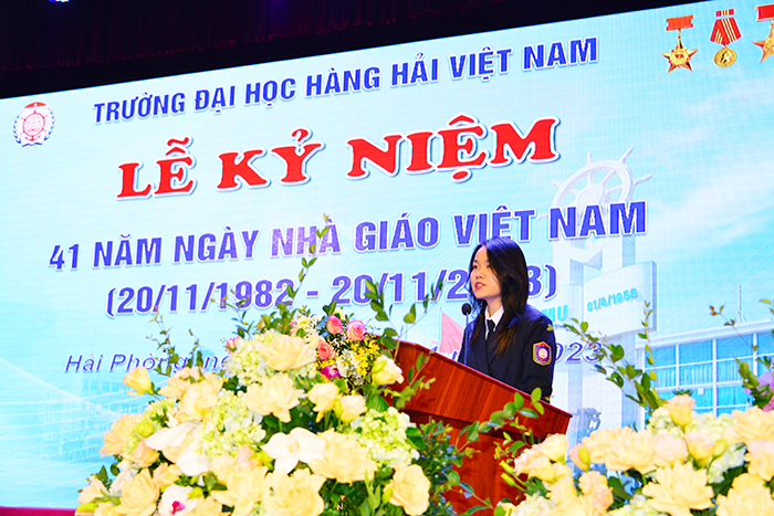 Sinh viên Nguyễn Thị Minh Anh - Lớp QKC62ĐH1, Khoa Máy tàu biển đại diện cho sinh viên, học viên toàn Trường lên phát biểu những suy nghĩ, những tình cảm tri ân các Thầy/Cô giáo nhân Ngày Nhà giáo Việt Nam 20/11
