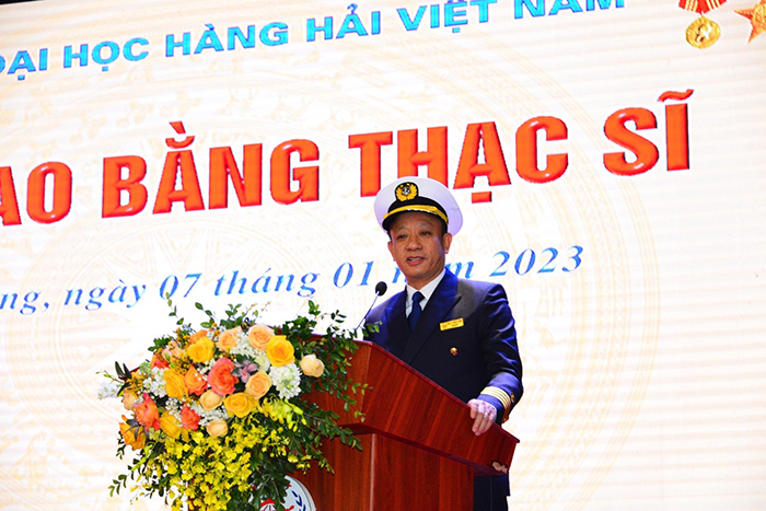 Thầy Hiệu trưởng nhấn mạnh: Ngày 23/11/2022, Bộ Chính trị đã ban hành Nghị quyết Số 30-NQ/TW về Phát triển kinh tế - xã hội và đảm bảo quốc phòng, an ninh vùng đồng bằng Sông Hồng đến năm 2030, tầm nhìn đến năm 2045, trong đó có nội dung: “Đẩy mạnh ứng dụng khoa học - công nghệ và đào tạo nhân lực biển; xây dựng Trường Đại học Hàng hải Việt Nam là trường trọng điểm quốc gia, nghiên cứu, đào tạo phục vụ phát triển bền vững kinh tế biển”. Và các tân thạc sĩ Trường Đại học Hàng hải Việt Nam chính là những “hạt giống đỏ”, tham gia chấp bút những dòng lịch sử của Nhà trường, góp phần vào sự phát triển đất nước nói chung và các cơ quan trên mọi miền Tổ quốc nói riêng.