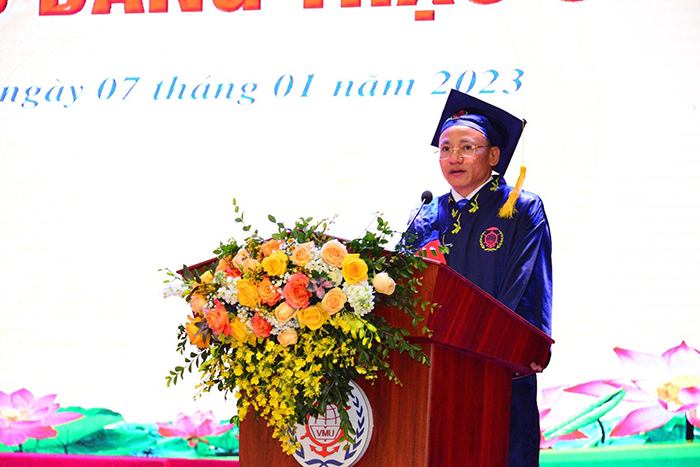 Phát biểu tại buổi lễ tốt nghiệp, Thầy Hiệu trưởng Phạm Xuân Dương đánh giá rất cao sự quyết tâm, kiên trì học tập của các nghiên cứu sinh, các học viên đã vượt qua rất nhiều khó khăn, đặc biệt là ảnh hưởng của đại dịch Covid - 19.