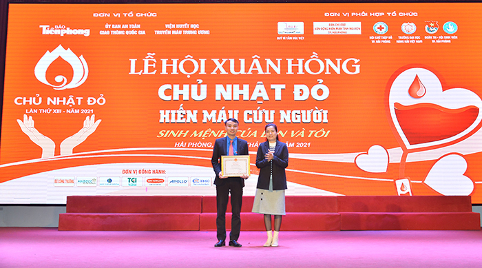 Sinh viên Lê Bích Phương Anh – Phó Chủ nhiệm CLB Hiến máu tình nguyện Trường ĐHHHVN – đại diện cho CLB Hiến máu tình nguyện Trường Đại học Hàng hải Việt Nam nhận Kỷ niệm chương từ Nhà báo Nguyễn Văn Hoàn – đại diện Báo Tiền Phong