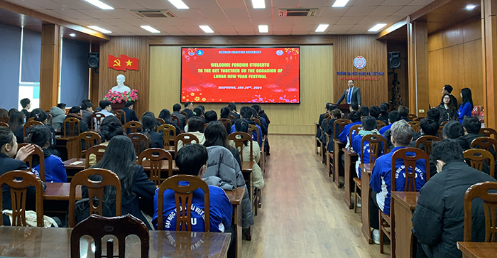 Phát biểu tại buổi lễ, PGS.TS. Nguyễn Minh Đức - Phó Hiệu trưởng Nhà trường điểm qua những thành tựu mà Nhà trường đã đạt được trong năm qua đồng thời ghi nhận những nỗ lực cố gắng trong học tập của các em lưu học sinh, sinh viên có kết quả học tập tốt. Qua đó, thầy Phó Hiệu trưởng Nhà trường đã gửi lời chúc nhân dịp Xuân mới Giáp Thìn 2024 tới các em sinh viên , đặc biệt là các sinh viên quốc tế, với mong muốn các bạn luôn vui vẻ, hạnh phúc, hưởng không khí Tết ấm cúng và đầy ý nghĩa cùng đất nước, con người Việt Nam.