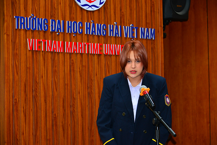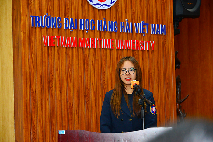 Sinh viên Trần Hương Trang - Lớp LHH63ĐH, Khoa Hàng hải đại diện cho các sinh viên có mặt trong buổi lễ phát biểu cảm ơn
