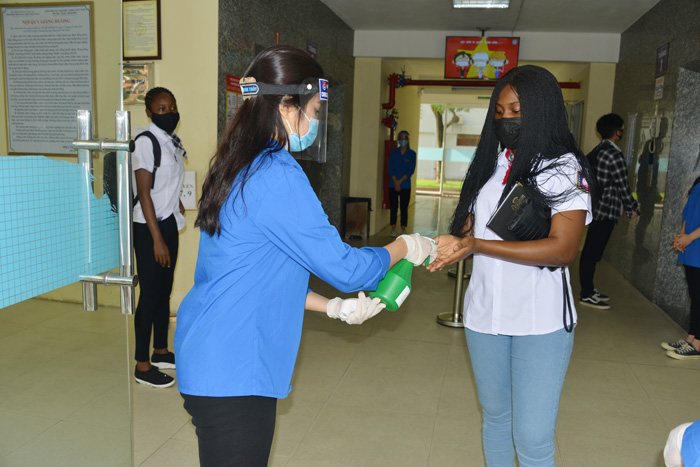 Cụ thể, Nhà trường đã chuẩn bị sẵn sàng khoảng 10.000 khẩu trang và hơn 300 lít nước sát khuẩn tay dự phòng để phục vụ sinh viên trong những ngày nhập học trở lại. Các phòng, ban liên quan thường xuyên lau dọn vệ sinh thiết bị dụng cụ học tập, phun thuốc khử trùng phòng làm việc, các giảng đường, nhà ăn, khu ký túc xá 1 tuần/ 1 lần. Các màn hình được lắp mới tại giảng đường A6, C1, C2 phát các clip hướng dẫn, tuyên truyền rộng rãi tới sinh viên các biện pháp tự đảm bảo an toàn cho bản thân.