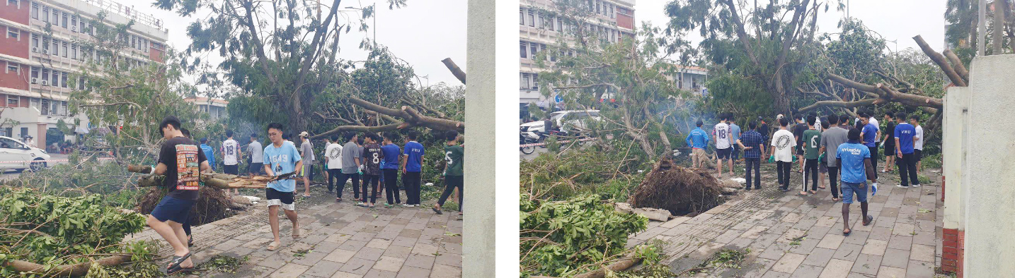 Trong khi công ty Công viên cây xanh và công ty Môi trường đô thị thành phố Hải Phòng đang phải căng mình, tập trung lực lượng để giải quyết hậu quả sau bão tại các khu vực trung tâm Thành phố, Trường ĐHHH VN không chỉ lo khắc phục các thiệt hại trong khuôn viên Nhà trường mà còn chung tay cùng Thành phố. Các CB, GV, sinh viên tình nguyện Nhà trường chỉ bằng các phương tiện sẵn có của mình đã trực tiếp cắt hạ các cành cây lớn gãy đổ ra đường Lạch Tray, thu gom số lượng lớn cành cây xếp gọn lên vỉa hè, tạo điều kiện cho các phương tiện dễ dàng lưu thông, chờ các đơn vị chức năng đến thu gom, xử lý.