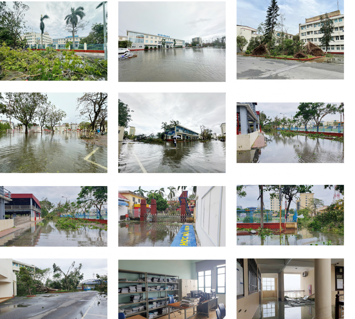 Ngay sáng 8/9, sau khi Bão số 3 suy yếu, dù trong điều kiện không có điện, nước sinh hoạt bị cắt, không có sóng điện thoại, khuôn viên Nhà trường cũng như các con đường dẫn tới Trường nước ngập sâu tới trên đầu gối, nhưng với tình yêu Trường và lòng nhiệt huyết, hàng trăm CB, GV, NLĐ, SV tình nguyện đã cùng với Ban lãnh đạo Trường, Ban chỉ huy PCTT&TKCN chủ động, khẩn trương xông pha, huy động các thiết bị cần thiết để cắt cành, các cành cây to chắn ngang lối đi, dọn lá, dọn đường, bảo vệ bệ và rễ các gốc cổ thụ bị đổ, đảm bảo cứu sống các cây đổ bằng mọi giá, cố gắng hết sức có thể nhằm trả lại những hàng cây xanh cho Trường với một tình yêu và nhiệt huyết hướng về Mái trường Đại dương thân yêu.