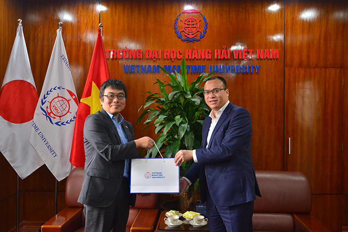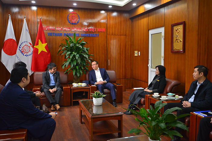 Đón tiếp đoàn công tác, về phía Trường Đại học Hàng hải Việt Nam có PGS.TS. Nguyễn Minh Đức - Phó Hiệu trưởng Nhà trường; cùng đại diện lãnh đạo Phòng Quan hệ quốc tế và Trung tâm Đào tạo Logistics tiểu vùng Mekong - Nhật Bản.