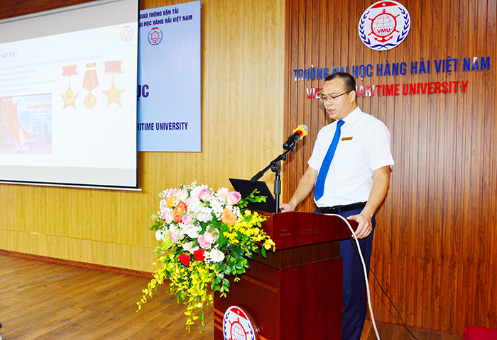 PGS.TS Nguyễn Minh Đức - Phó Hiệu trưởng phát biểu khai mạc và tóm tắt quá trình phát triển để Trường Đại học Hàng hải Việt Nam đạt được tiêu chuẩn chất lượng cơ sở giáo dục