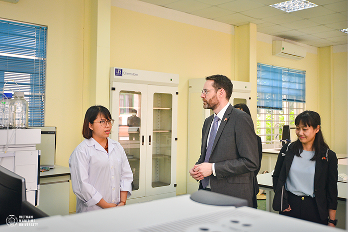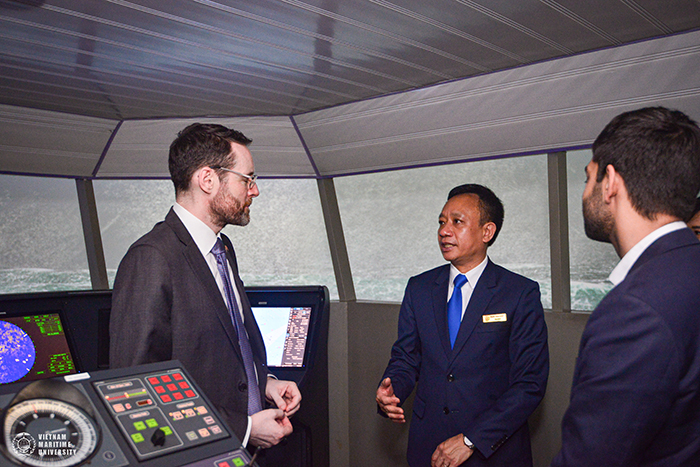 Sau buổi đón tiếp, Hiệu trưởng Phạm Xuân Dương, Đại sứ Iain Grant Frew cùng các cán bộ hai bên đã tiến hành đi tham quan cơ sở vật chất của Khoa Hàng hải, Khoa Máy tàu biển và Viện Môi trường. Thay mặt Nhà trường, PGS. TS. Phạm Xuân Dương bày tỏ sự cảm ơn sâu sắc với Ngài Đại sứ và các cán bộ, viên chức của Đại sứ quán Vương quốc Liên hiệp Anh và Bắc Ailen đã luôn quan tâm, tin tưởng và hỗ trợ Nhà trường.