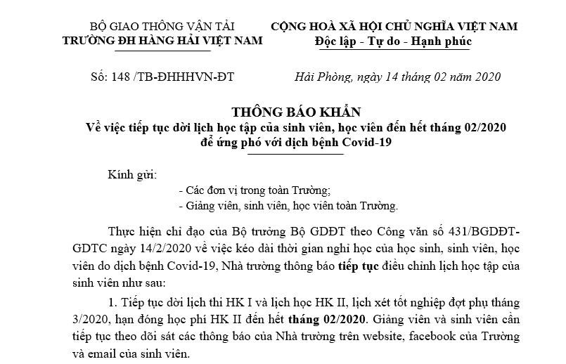 Thông báo KHẨN về việc tiếp tục dời lịch học tập của sinh viên, học viên đến hết tháng 02/2020 để ứng phó với dịch bệnh Covid-19