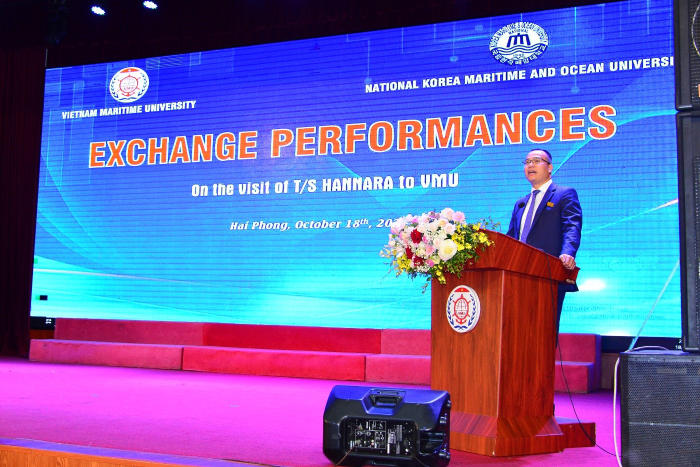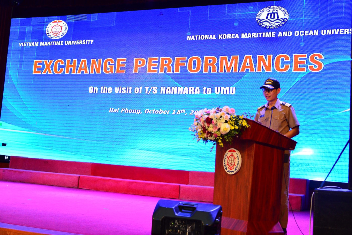 Trong khuôn khổ của chuyến thăm, sáng 18/10, Đoàn cán bộ, giảng viên và sinh viên của Trường Đại học Hàng hải và Hải dương Hàn Quốc tham quan cơ sở vật chất và môi trường học tập trên Tàu huấn luyện VMU Việt-Hàn do Trường Đại học Hàng hải Việt Nam quản lý. Thuyền trưởng Kang Minkyoon chia sẻ rằng đây là con tàu mà ngài Thuyền trưởng đã từng thực tập khi còn là sinh viên vào 24 năm về trước, về những câu chuyện gắn liền với con tàu đã hỗ trợ công tác đào tạo huấn luyện hàng hải của Trường Đại học Hàng hải và Hải dương Hàn Quốc, qua đó giúp cho sinh viên hai Trường hiểu hơn về lịch sử của con tàu Hannara.