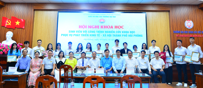 Sinh viên các trường đại học trên địa bàn thành phố Hải Phòng có công trình nghiên cứu tại Hội nghị chụp ảnh lưu niệm cùng Hội đồng khoa học đánh giá công trình nghiên cứu